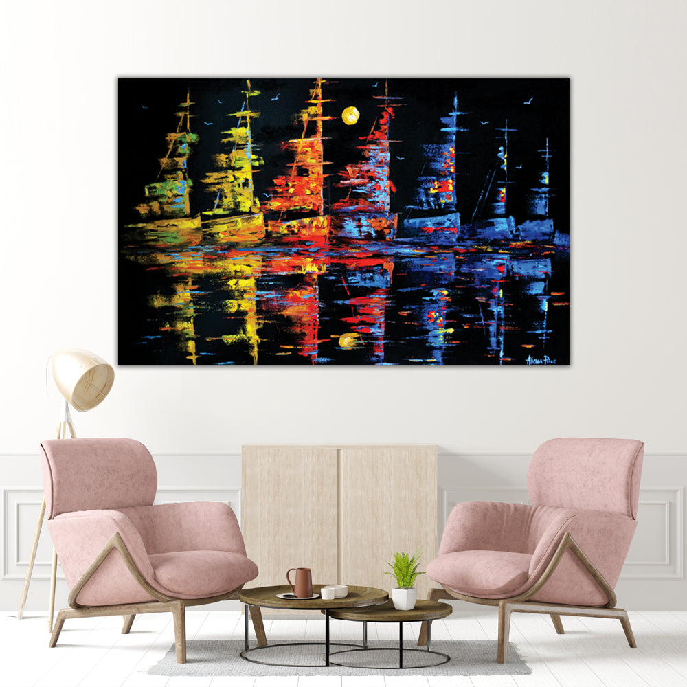 Canvas Painting – Beautiful Ships In Ocean At Night Art Modern Wall Painting