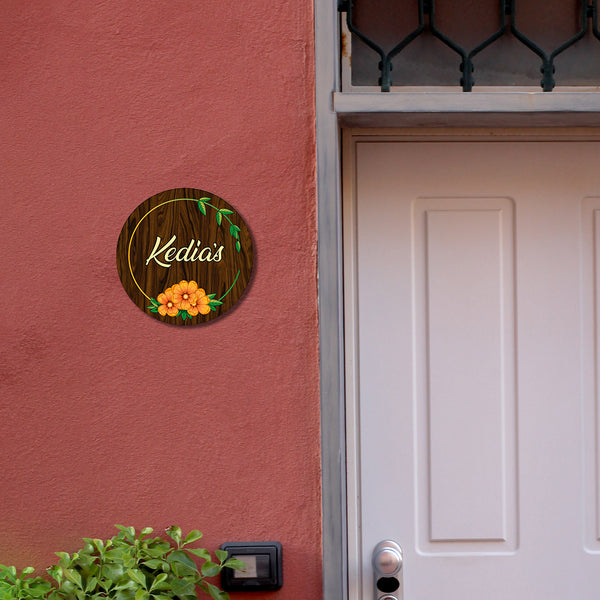 Round Wooden Floral Premium Name Plate | Personalized Natural Finish Wall Decor