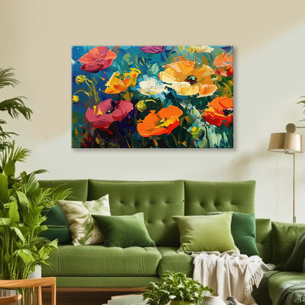Vibrant Floral Garden Canvas Wall Art for Living Room & Bedroom | Colorful Blooming Flowers Modern Painting | Nature-Inspired Abstract Art